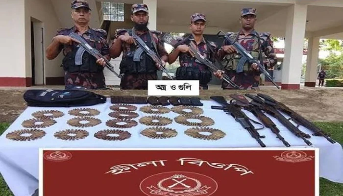উদ্ধারকৃত অস্ত্রের মধ্যে রয়েছে— দুটি জি-৩ রাইফেল, একটি এমএ-১ (ভ্যারিয়েন্ট এমকে-২) রাইফেল, একটি এলএম-১৬ রাইফেল, আটটি ম্যাগাজিন এবং মোট ৫০৭ রাউন্ড গুলি। এর মধ্যে ১৯৯ রাউন্ড জি-৩, ১২০ রাউন্ড এমএ-১ এবং ১৮৮ রাউন্ড এলএম-১৬ এর গুলি রয়েছে।