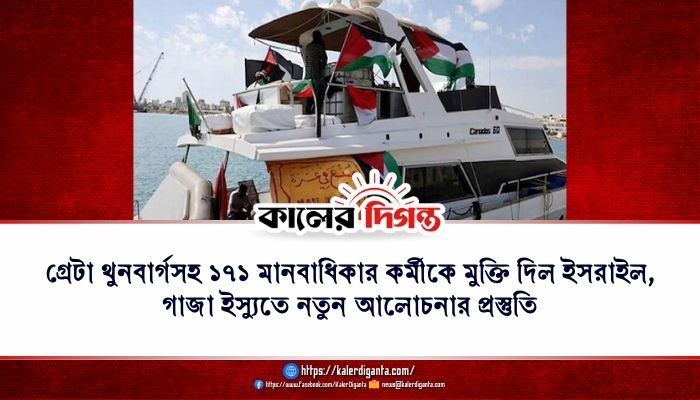 গাজামুখী ত্রাণবাহী নৌবহর সুমুদ ফ্লোটিলা থেকে আটক করা সুইডিশ জলবায়ু কর্মী গ্রেটা থুনবার্গসহ ১৭১ জন মানবাধিকার ও শান্তিকর্মীকে মুক্তি দিয়েছে ইসরাইল। দেশটির কর্মকর্তারা জানিয়েছেন, মুক্তি পাওয়া ব্যক্তিদের গ্রিস ও স্লোভাকিয়ায় পাঠানো হয়েছে। মুক্তিপ্রাপ্তদের মধ্যে গ্রিস, ইতালি, ফ্রান্স, আয়ারল্যান্ড, সুইডেন, পোল্যান্ড, জার্মানি, বুলগেরিয়া, লিথুয়ানিয়া, অস্ট্রিয়া, লুক্সেমবার্গ, ফিনল্যান্ড, ডেনমার্ক, স্লোভাকিয়া, সুইজারল্যান্ড, নরওয়ে, যুক্তরাজ্য, সার্বিয়া এবং যুক্তরাষ্ট্রের নাগরিক রয়েছেন।
