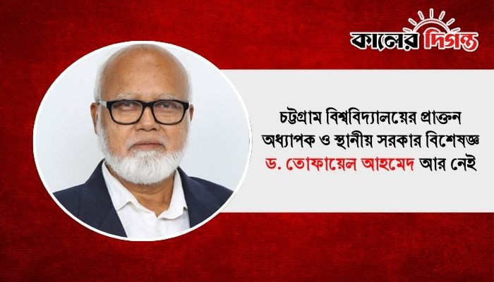চট্টগ্রাম বিশ্ববিদ্যালয়ের সিন্ডিকেট সদস্য ও স্থানীয় সরকার বিশেষজ্ঞ অধ্যাপক ড. তোফায়েল আহমেদ আর নেই। বুধবার (৮ অক্টোবর) রাত ৯টার দিকে রাজধানীর একটি বেসরকারি হাসপাতালে চিকিৎসাধীন অবস্থায় তিনি শেষ নিঃশ্বাস ত্যাগ করেন। মৃত্যুর পর রাতেই তার মরদেহ নিজ শহর চট্টগ্রামে নেওয়া হয়, যেখানে দাফন সম্পন্ন করা হবে বলে পারিবারিক সূত্রে জানা গেছে।