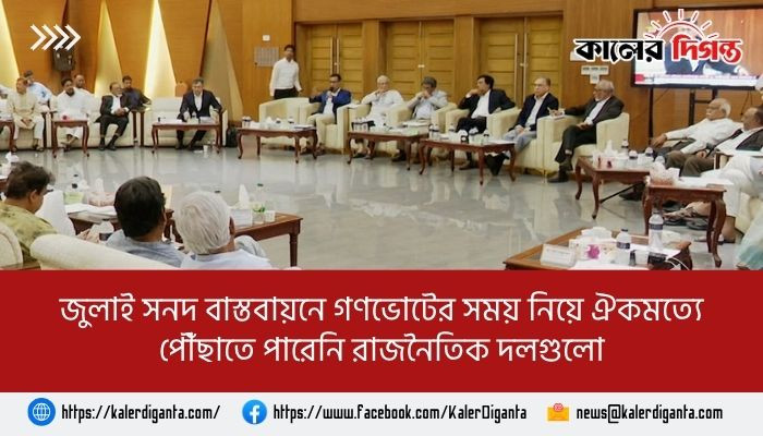 জাতীয় ঐকমত্য কমিশনের দীর্ঘ আলোচনার পর রাজনৈতিক দলগুলোর সাথে বৈঠক শেষ হয়েছে, তবে জুলাই সনদ বাস্তবায়নে গণভোটের সময়সীমা নিয়ে এখনও চূড়ান্ত সিদ্ধান্তে আসা যায়নি। বুধবার (৮ অক্টোবর) রাত সাড়ে ১১টায় কমিশনের সহ-সভাপতি অধ্যাপক ড. আলী রীয়াজ আনুষ্ঠানিকভাবে বৈঠকের সমাপ্তি ঘোষণা করেন।