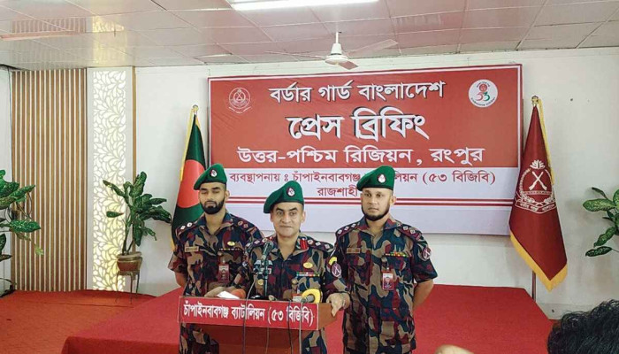 সোমবার (১৩ অক্টোবর) দুপুরে চাঁপাইনবাবগঞ্জের ৫৩ বিজিবি ব্যাটালিয়নের সদর দপ্তরে আয়োজিত এক সংবাদ সম্মেলনে এ তথ্য জানান ব্যাটালিয়ন অধিনায়ক লেফটেন্যান্ট কর্নেল কাজী মুস্তাফিজুর রহমান।