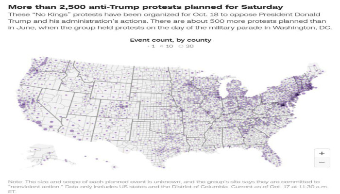 যুক্তরাষ্ট্রজুড়ে ‘নো কিংস’ শিরোনামে ট্রাম্পবিরোধী বিক্ষোভে অংশ নিয়েছেন হাজার হাজার মানুষ। ৫০টি অঙ্গরাজ্যের ২,৭০০-এর বেশি শহরে এই কর্মসূচি পালিত হচ্ছে, যেখানে অংশগ্রহণকারী সংগঠনগুলো ট্রাম্পের অভিবাসন, শিক্ষা ও নিরাপত্তানীতির কঠোর সমালোচনা করছে।